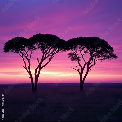 © Goody ART, Fototapeta premium Silhouetted trees against a vibrant purple and pink sunset, creating a serene and picturesque landscape.