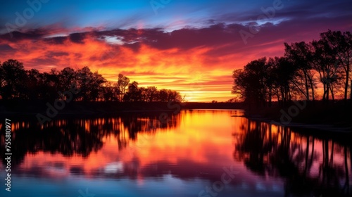 © Cloudyew, Fototapeta premium Silhouetted trees along a riverbank during a colorful sunset