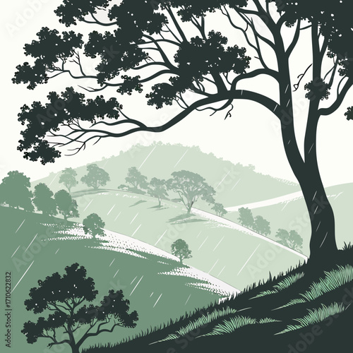 Naklejka premium Silhouetted trees on rolling hills under a gentle rain shower in a muted...