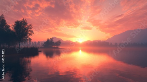 Naklejka premium Silhouetted Trees Reflecting in a Misty Lake at Sunset, nature , landscape