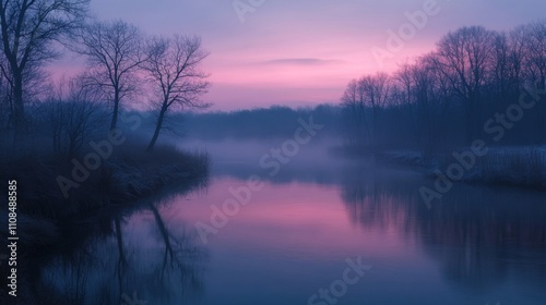 © Vader Stocker, Obraz premium Silhouetted Trees Reflecting in a Misty River at Sunrise