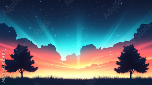 Naklejka premium Silhouetted trees stand against a vibrant, colorful sunset sky.