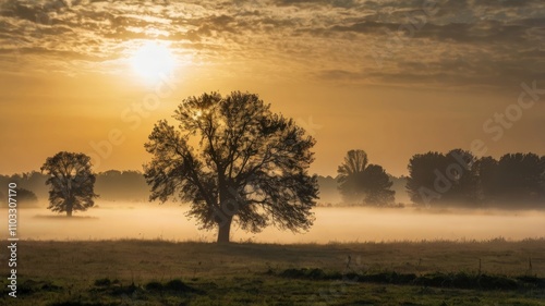 Obraz premium Silhouetted trees stand in a misty field at sunrise. Golden hour light bathes...
