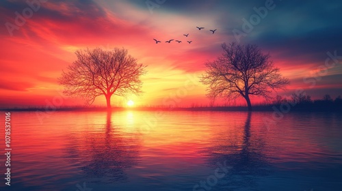 © cusniatul, Obraz premium Silhouetted trees stand on a calm lake at sunset, with birds flying overhead. The water reflects the vibrant sky.