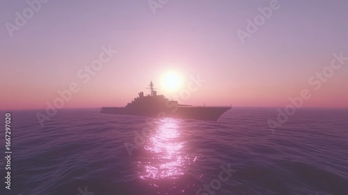 Fototapeta premium Silhouetted warship at sunset over calm ocean