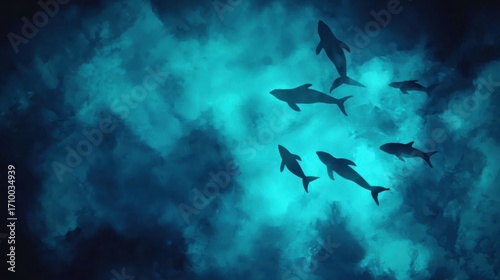 © harryaishi, Obraz premium Silhouetted whales swim in a deep blue ocean, surrounded by cloudy water.