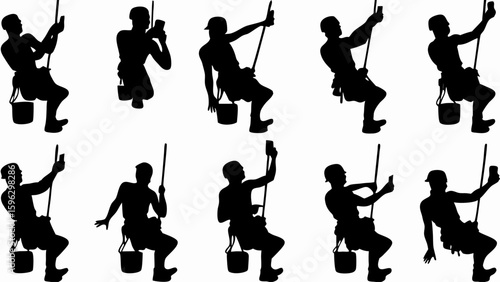 © VectorVista, Obraz premium Silhouetted window washers suspended on ropes with buckets and squeegees in various positions