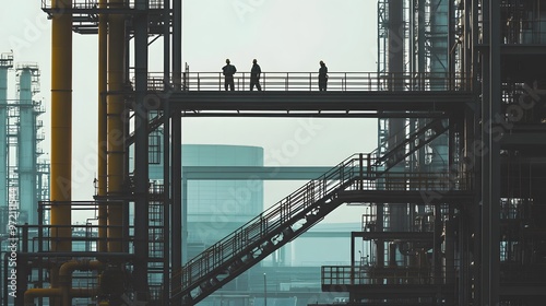 © sungedi, Fototapeta premium Silhouetted Workers on a Platform in an Industrial Complex