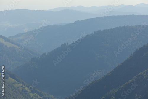 © jiriviehmann, Fototapeta premium Silhouetten im Schwarzwald. Auf dem Feldberg Blick Richtung Todtnau.