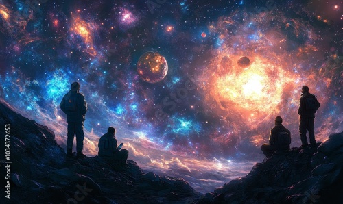 © jambulart, Fototapeta premium Silhouettes gaze at a cosmic nebula.