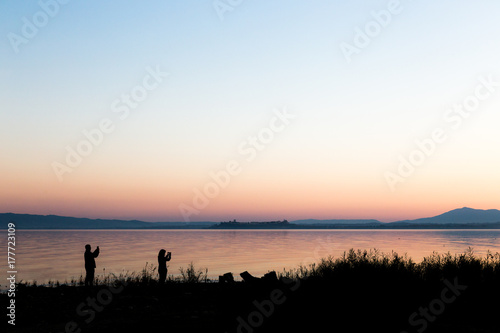 © Massimo, Obraz premium Silhouettes of a couple on a lake shore taking photos of sunset with their cell phones