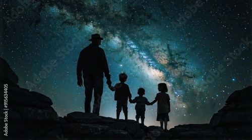 © paper later, Fototapeta premium Silhouettes of a Family Gazing at the Milky Way