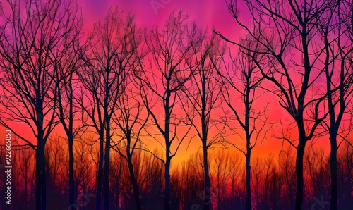 Fototapeta premium Silhouettes of bare trees, vibrant sunset backdrop, bold contrasts, autumnal...