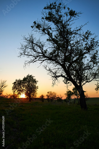 © Sea_Inside_Soul, Fototapeta premium Silhouettes of big and small trees and bushes in evening setting sun. Transition from a bright orange sunset to a blue sky. Twilight in nature, countryside