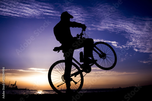 Obraz premium Silhouettes of biking man at beautiful sunset