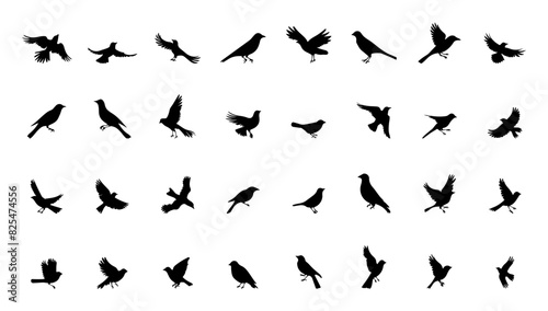 © GOLDMAN, Naklejka premium Silhouettes of birds doodle set. Black collection design animal cartoon for nature. Element graphic drawing sketch and isolated white background. Abstract decoration symbol