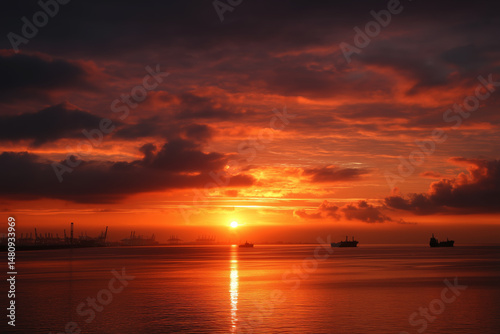 Naklejka premium Silhouettes of cargo ships at sea during vibrant sunset with industrial port in background