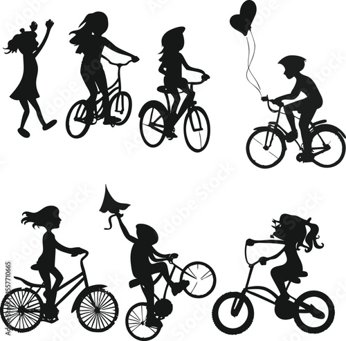 Fototapeta premium Silhouettes of children enjoying bicycle rides with creative and playful activities