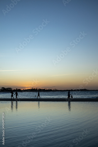 © Horacio Selva, Obraz premium Silhouettes of children playing on the beach at sunset.
