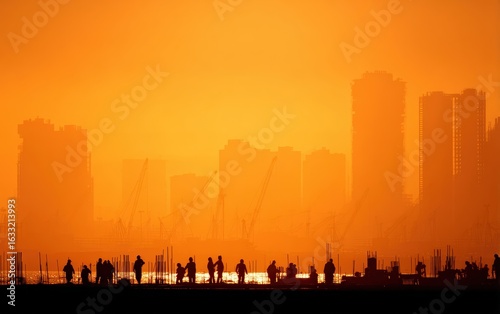 Fototapeta premium Silhouettes of construction workers building new skyscrapers at sunset with cranes and buildings in the background