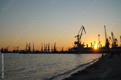 © ReitNN, Obraz premium Silhouettes of cranes and ships against the setting sun.