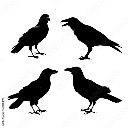 Obraz premium Silhouettes of Crows in Various Standing and Calling Poses – Vector Crow Graphics for Wildlife Art, Halloween Decor, Bird Illustrations, Nature Projects, and Gothic Design Collections