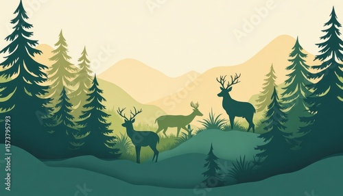 © Anak, Obraz premium Silhouettes of deer in a lush forest landscape.