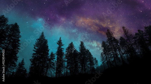 © shooreeq, Fototapeta premium Silhouettes of dense pine trees on a ridge, sharp black against a glowing cosmic sky with swirling nebulas