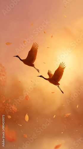 © fadi, Obraz premium Silhouettes of flying birds against golden orange sunset sky with falling autumn leaves