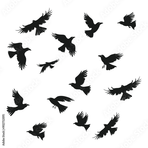 © Suhardi, Obraz premium Silhouettes of 15 flying birds isolated on white background.