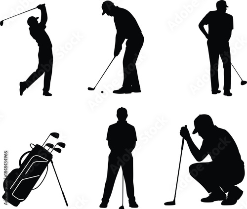 Obraz premium Silhouettes of golfers in various poses with clubs and bag on white background Keywords: golfer, golf, silhouette, man, male