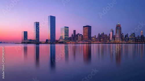 © Matcha_09, Obraz premium Silhouettes of iconic corporate towers reflecting on calm waters at dusk.