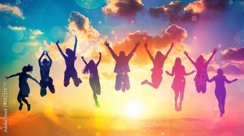 © Nima, Naklejka premium Silhouettes of Joyful People Jumping at Sunset - A vibrant sunset sky with silhouettes of people jumping in a joyful celebration, showcasing a feeling of happiness, freedom, and optimism. - A vibrant
