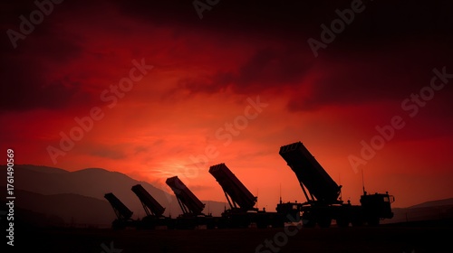 © irawan, Obraz premium Silhouettes of missile launchers against a dramatic red sunset sky.