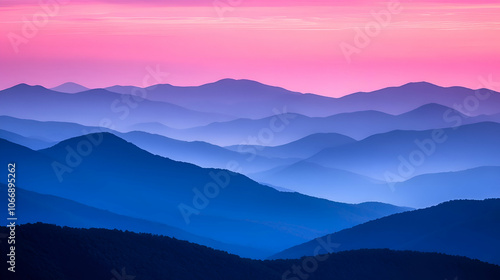 © bcendet, Obraz premium Silhouettes of mountain ranges against a pink and blue sky at sunrise.