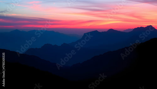 © Yusuf, Fototapeta premium silhouettes of mountains with red light, colorful. White tone