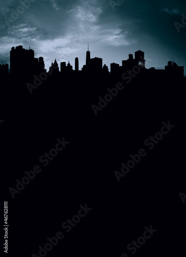 Naklejka premium Silhouettes of New York City skyline buildings with dark swirling storm clouds overhead and empty space