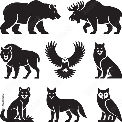 Fototapeta premium Silhouettes of North American Wildlife Animals in Black and White Keywords:...