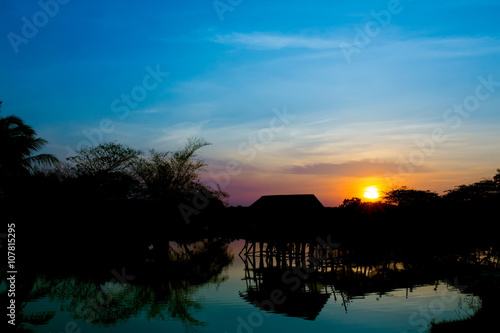 © singto2, Fototapeta premium Silhouettes of Old cottage in the lake.
