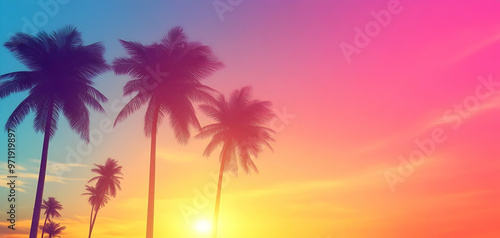 Naklejka premium Silhouettes of palm trees against a colorful sunset sky.