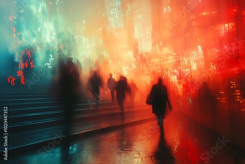 © anastasiia, Obraz premium Silhouettes of people in a futuristic city with vibrant lights.