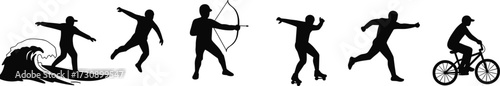 © Hasib World, Obraz premium Silhouettes of people in motion, dynamic sports poses, surfing, skating, archery, cycling, dancing, active lifestyle, fitness, recreation