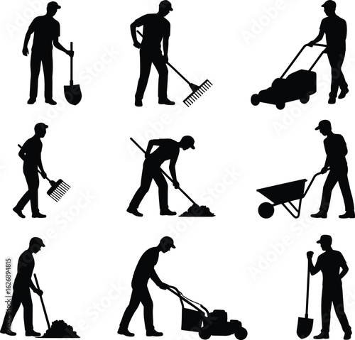 © Hasib World, Obraz premium Silhouettes of people performing gardening and landscaping tasks with tools like shovels, rakes, wheelbarrows, ideal for vector illustrations