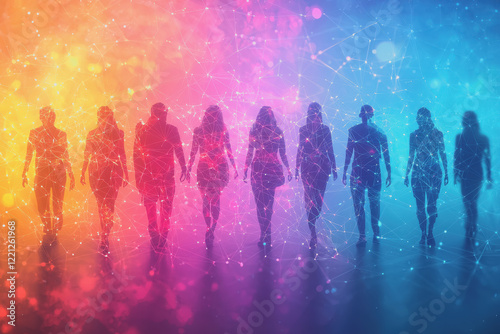 Obraz premium Silhouettes of people walking in a network representing connectivity and...
