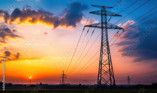 Fototapeta premium Silhouettes of power lines against colorful sunset sky