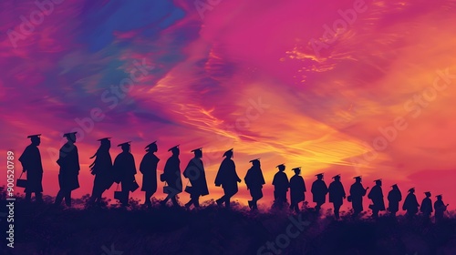 Obraz premium Silhouettes of students with graduate caps in a row on panoramic sunset...