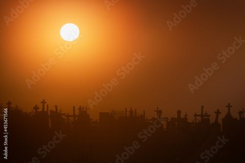 © Uladzimir, Obraz premium Silhouettes of the crosses of the Catholic cemetery in the fog in the early morning at dawn. Place for your text.
