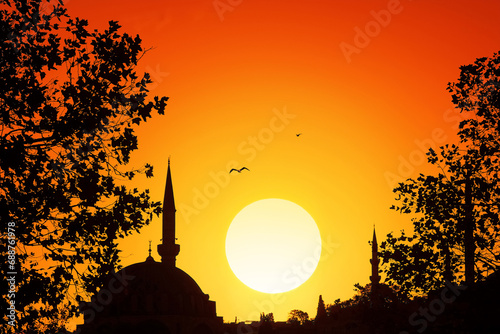 © delbars, Obraz premium silhouettes of the mosque minarets and treetops at sunset. Istanbul. Turkey.