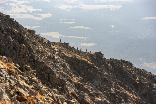 © Jacek Jacobi, Naklejka premium Silhouettes of tourists on the Krywan ridge. High Tatra Mountains. Slovakia.