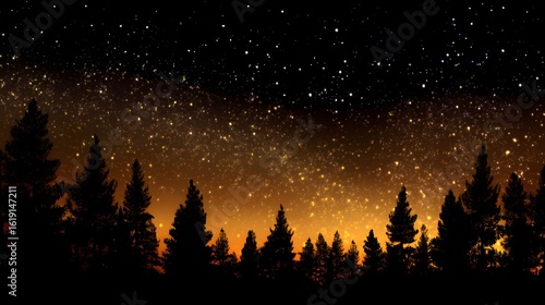 © kirania, Naklejka premium Silhouettes of trees against a starry night sky.